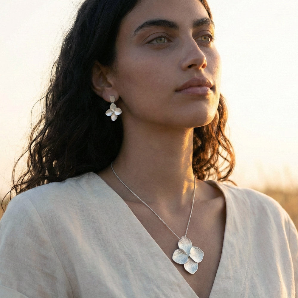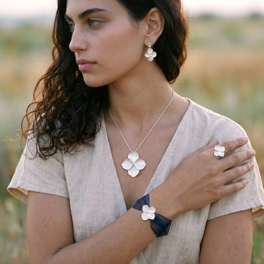 Nuestras joyas están hechas a partir de verdaderas flores de Hortensia, capturando su belleza natural en plata de ley 925.